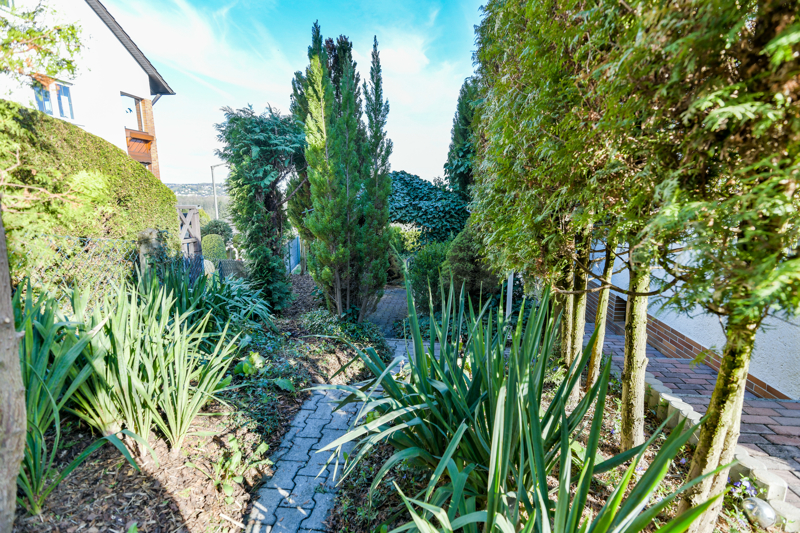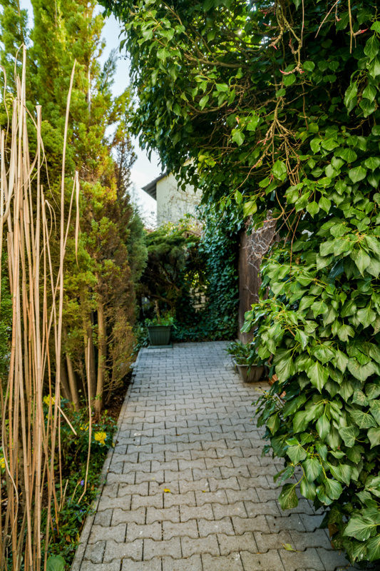 Über den weitläufigen idyllischen Garten gelangen Sie zum Haupteingang des Hauses.