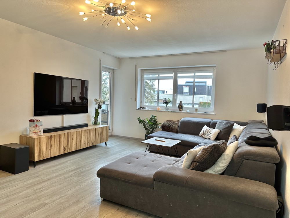 Das große Wohnzimmer ist hell und freundlich gestaltet. Der Zugang zum sonnigen Balkon schafft eine perfekte Verbindung von Wohn- und Außenbereich.