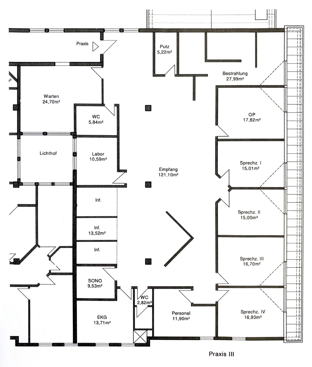 Circa 335 Quadratmeter Nutzfläche, verteilt auf 7 individualisierbare Aufenthaltsräume (mit Aussenfenstern), Wartezimmer und Laborraum (beide mit Befensterung zum Lichthof), einen großen, zentralen Empfangsraum und weiteren Nebenräume (Toiletten, Putzraum, etc.) - siehe Plan im Bildteil.