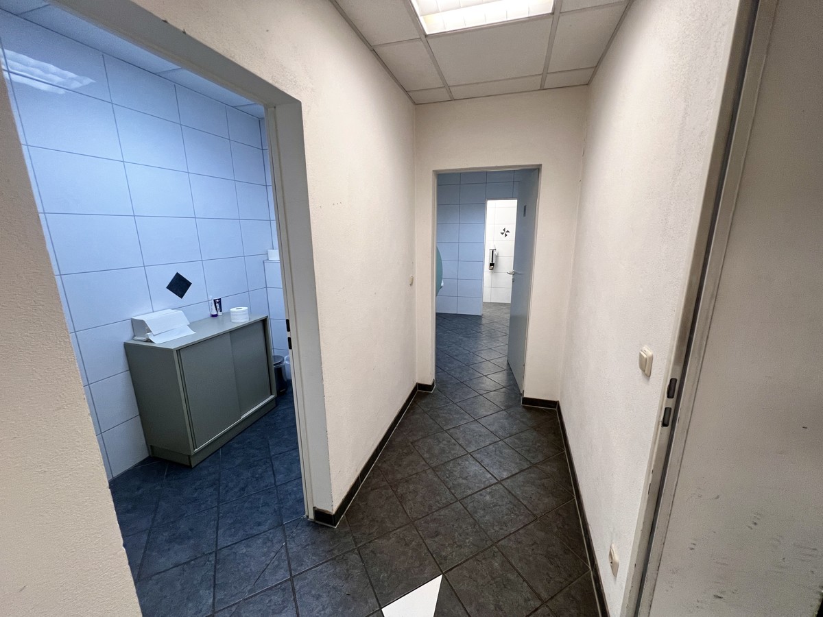 Das Erdgeschoss des Hauptgebäudes umfasst weitere vier Büroräume, ebenfalls auf ca. 175 m². Neben einer funktionalen Küche und zwei zusätzlichen WC-Einheiten befinden sich hier der Haupteingang und die Zugänge zum Nebengebäude/Halle, was eine reibungslose interne Erschließung ermöglicht. Auch hier ist ein einheitlicher Laminatboden verlegt, der für eine professionelle Optik sorgt.