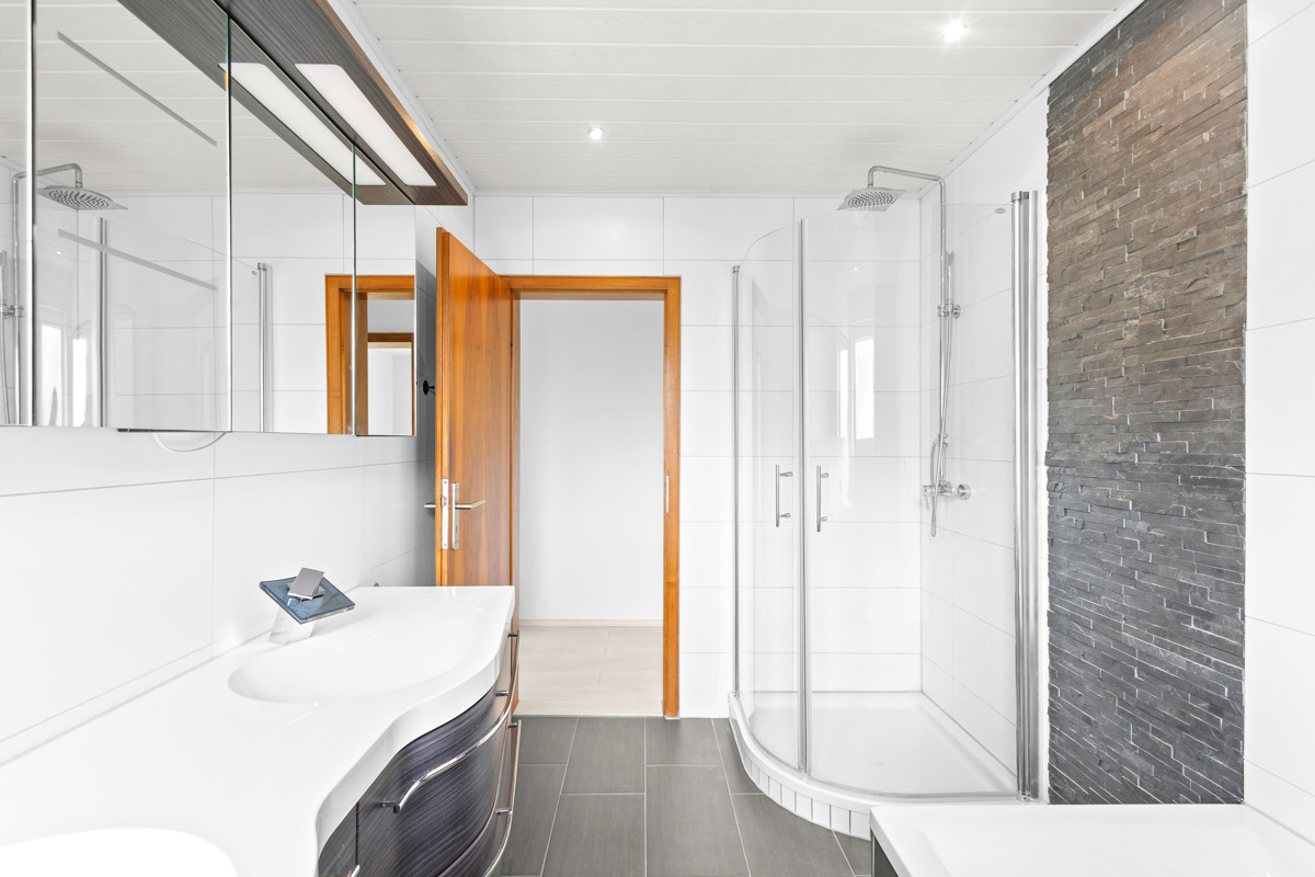 Ergänzt wird das Raumangebot durch ein modernes Tageslichtbad mit Badewanne, ein separates Gäste-WC sowie eine hochwertig ausgestattete Einbauküche, die nicht nur funktional, sondern auch optisch überzeugt.