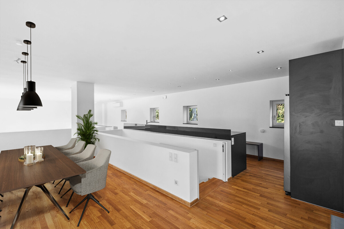 Erweitert wird der Wohnbereich im ersten Stockwerk. Über eine einläufige Treppe erschlossen befindet sich die offene, hochwertige Küche (von Poggenpohl, alle Geräte von Gaggenau) auf einer über 70m² großen Galerie. Hier finden Sie Platz für eine lange Tafel für sich und Ihre Gäste, zusätzlich lässt sich hier aber auch noch ein Arbeitsplatz mit Blick in den Garten einrichten.