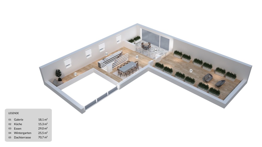 Selbst der Wintergarten ist beheizbar und mit rund 25 m² mehr als nur eine Wohnraumerweiterung. Auch von hier aus ist die rund 70 m² große Dachterrasse erreichbar. Diese ist teilweise überdacht, einen zusätzlichen Sonnenschutz bietet eine elektrische Markise.
