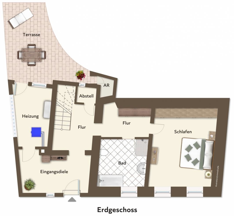Über die Eingangsdiele Ihres Erdgeschosses in den Flur eintretend, erreichen Sie rechter Hand Ihr Badezimmer - mit Wanne und Dusche - sowie Ihr Schlafzimmer.