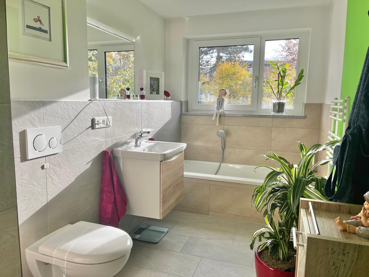 Das moderne Badezimmer präsentiert sich elegant mit begehbarer Dusche, Badewanne und hochwertigen Fliesen – perfekt für entspannte Momente nach einem langen Tag.
