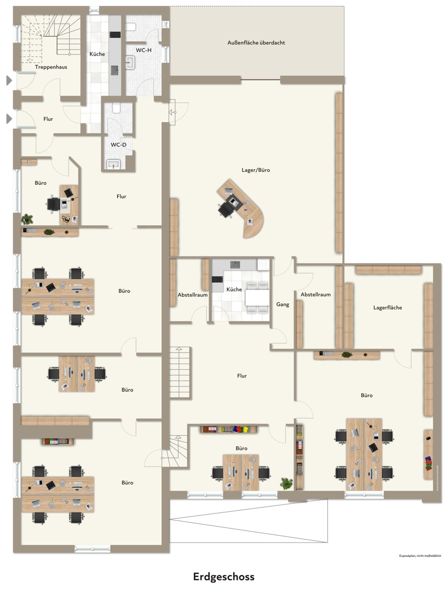 Das Erdgeschoss des Hauptgebäudes umfasst weitere vier Büroräume, ebenfalls auf ca. 175 m². Neben einer funktionalen Küche und zwei zusätzlichen WC-Einheiten befinden sich hier der Haupteingang und die Zugänge zum Nebengebäude/Halle, was eine reibungslose interne Erschließung ermöglicht. Auch hier ist ein einheitlicher Laminatboden verlegt, der für eine professionelle Optik sorgt.