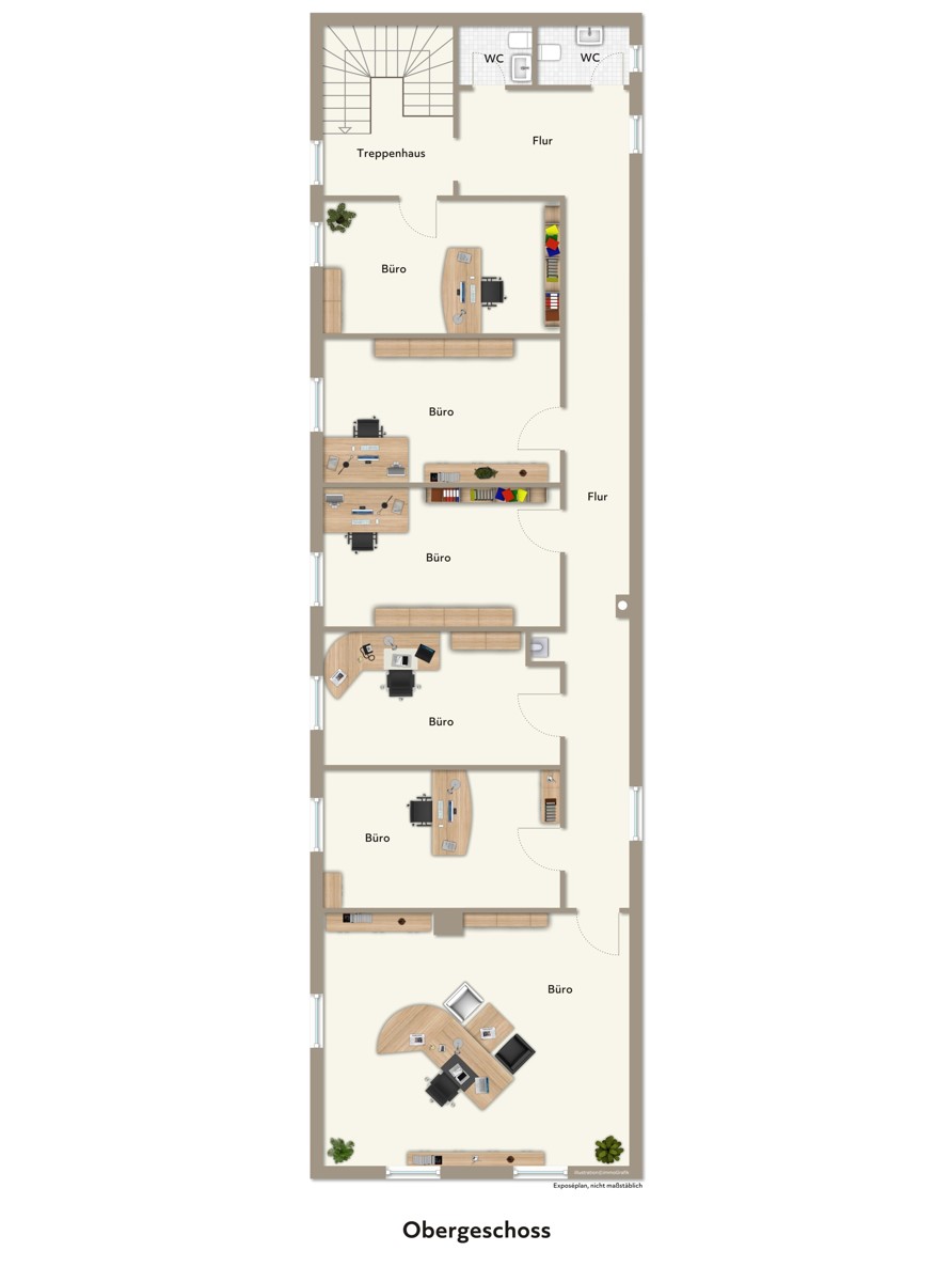 Im Obergeschoss des Hauptgebäudes stehen derzeit sechs helle Büroräume zur Verfügung, verteilt auf ca. 175 m². Zwei separate WC-Anlagen sind ebenfalls vorhanden. Die Räume sind mit einem pflegeleichten Laminatboden ausgestattet, die Fenster wurden im Jahr 2000 durch zweifach verglaste Kunststoffelemente ersetzt und sorgen für ausreichend Tageslicht.