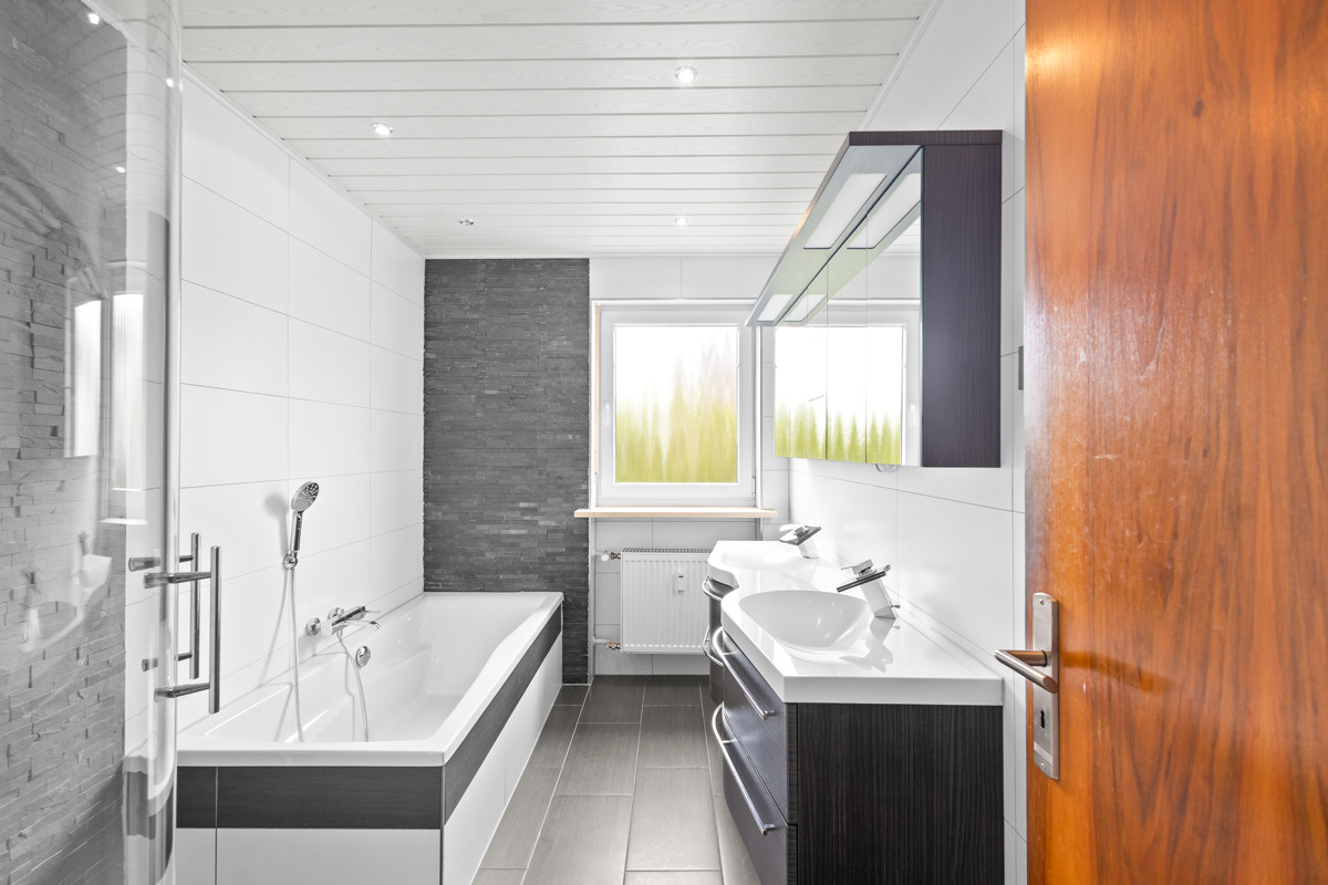 Ergänzt wird das Raumangebot durch ein modernes Tageslichtbad mit Badewanne, ein separates Gäste-WC sowie eine hochwertig ausgestattete Einbauküche, die nicht nur funktional, sondern auch optisch überzeugt.