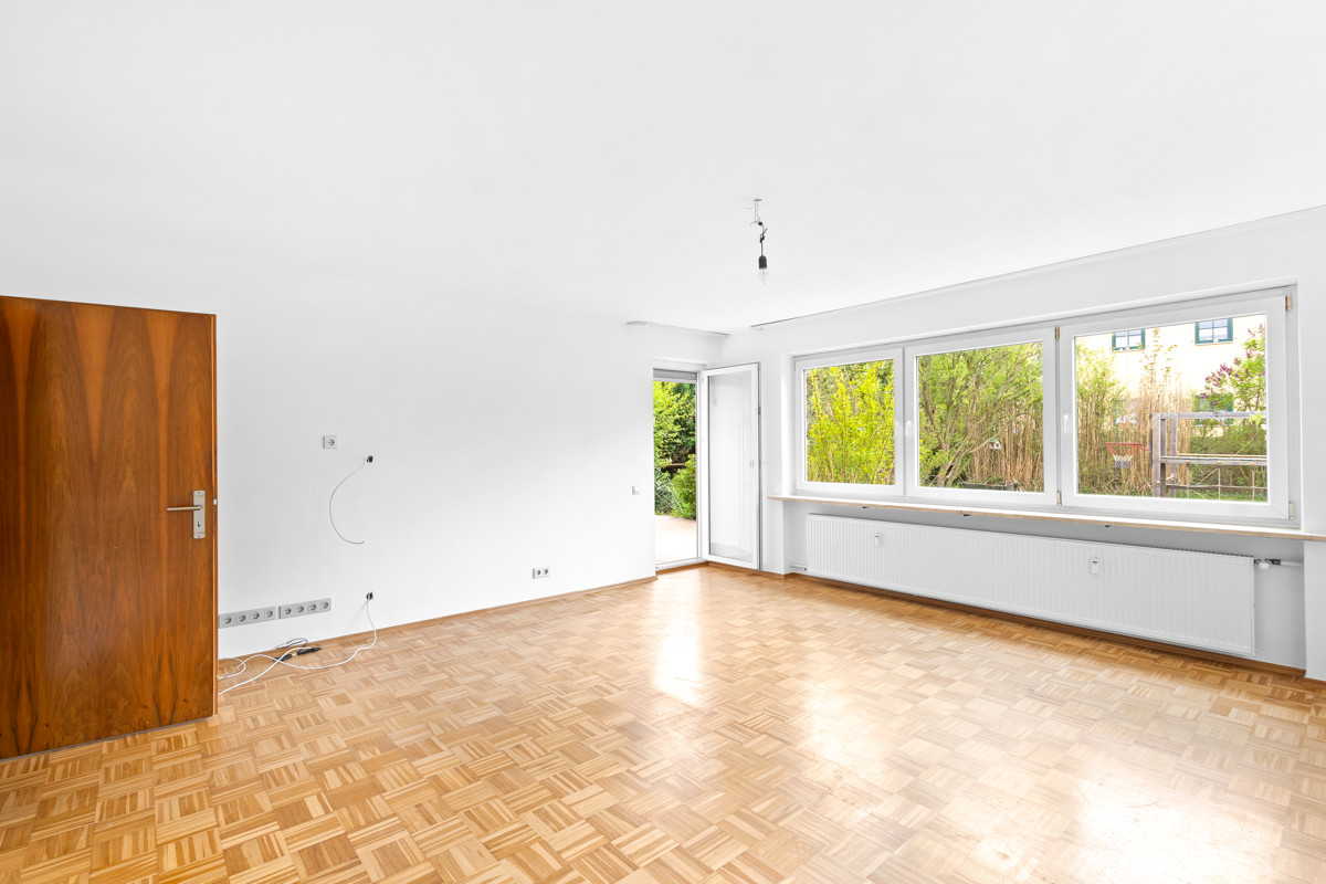 Der lichtdurchflutete Wohn- und Essbereich bildet das Herzstück der Wohnung und öffnet sich zur sonnigen Terrasse und dem weitläufigen Garten – eine grüne Oase der Ruhe mitten in der Stadt.