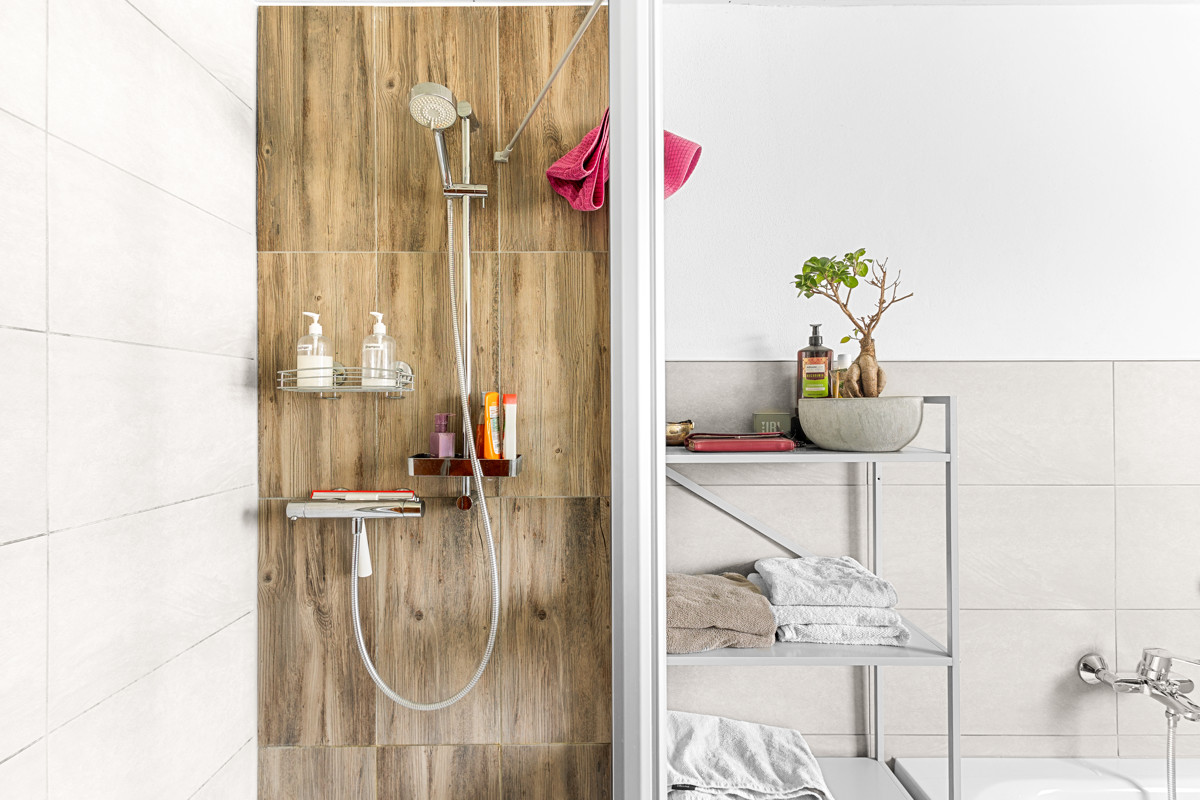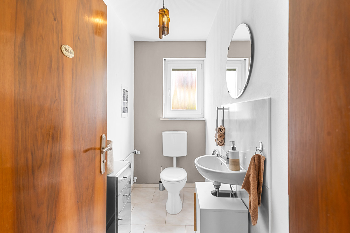 Das moderne Tageslichtbad ist mit Badewanne, separater Dusche und einem stilvollen Waschbecken ausgestattet. Ein separates WC ergänzt das Raumangebot.