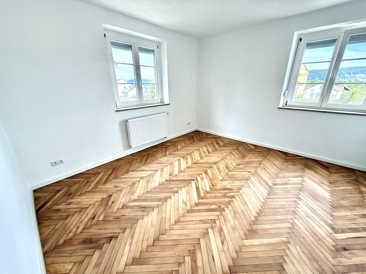 So mit dem Vinyl als neuem Bodenbelag durchgehend Ihrer Wohnung - nur in Ihrem möglichen Schlafzimmer wurde der Fischgrät Parkett wieder aufgearbeitet.