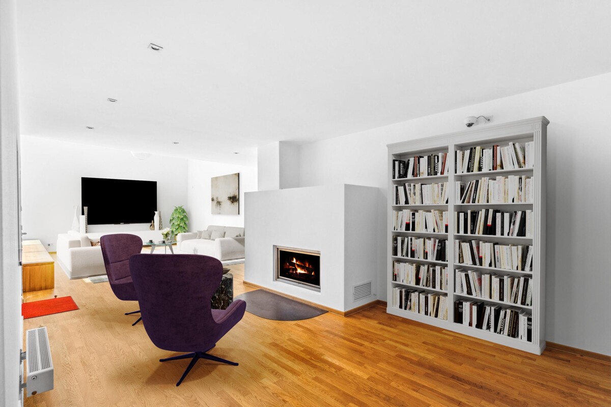 Im Inneren erleben Sie dann gleich mehrere Highlights. Allen voran das ca. 5,50 m hohe Wohnzimmer mit einer raumhohen Verglasung. Dieses lässt sich über zwei schiebbare Sonnenschilder verschatten, dabei erzeugt die lochblechartige Struktur ganz besondere Licht-/Schatteneffekte. Ein weiteres Highlight ist der Kaminofen. Dieser vermittelt eine Gemütlichkeit und ist gleichzeitig zur Seite so abgeschirmt, dass Sie einen großen Fernseher daneben aufhängen oder stellen könnten. Der Massiv-Holz-Parkett wurde gerade neu abgeschliffen und sieht sehr edel aus.