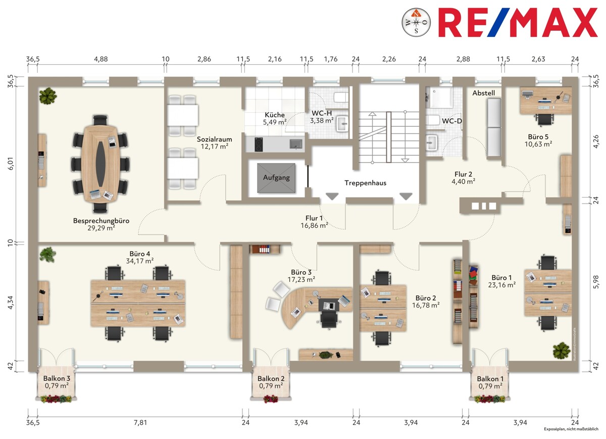 - 3 unterschiedliche Größen von Büros mit 13,4 m² bis zu 34,17 m²