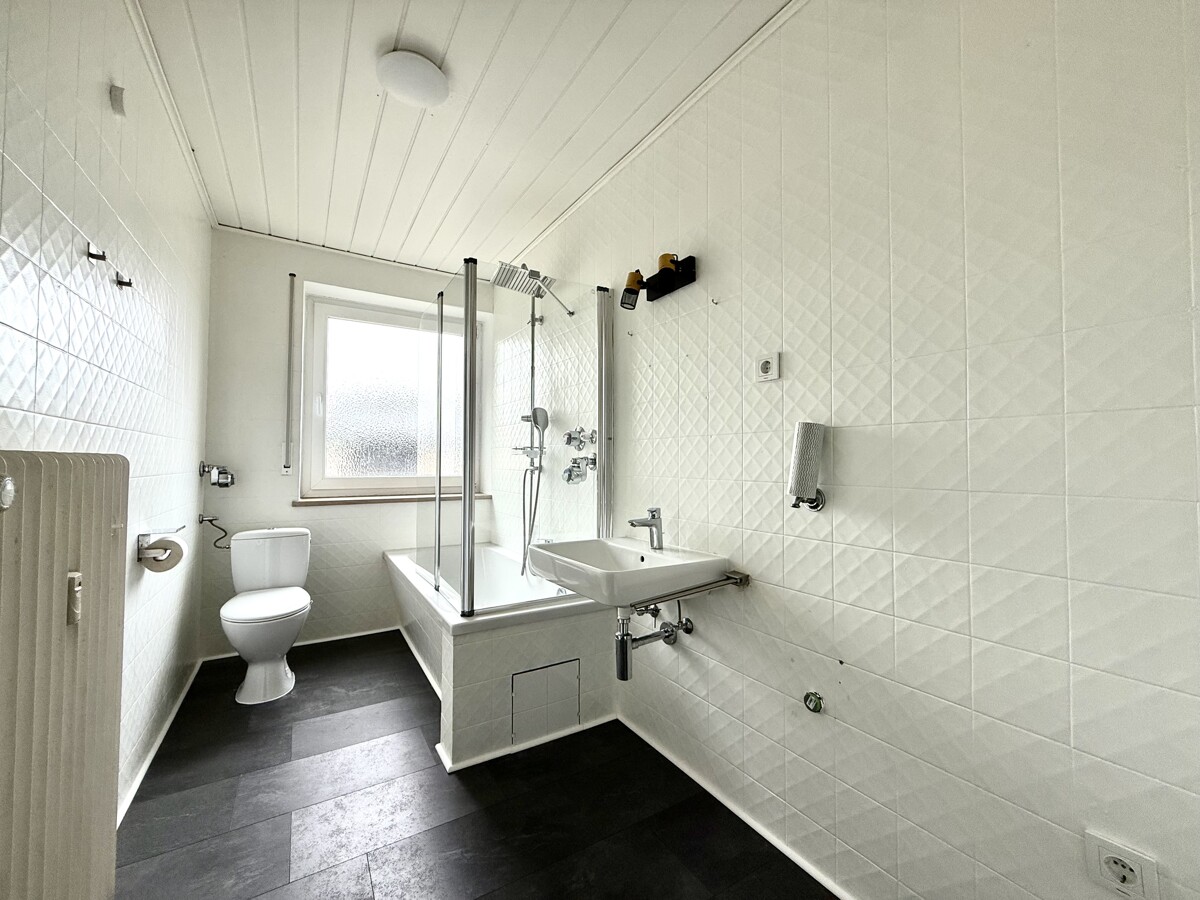 *Badezimmer mit Badewanne und integrierter Duschfunktion, Waschbecken, WC und Waschmaschinenanschluss